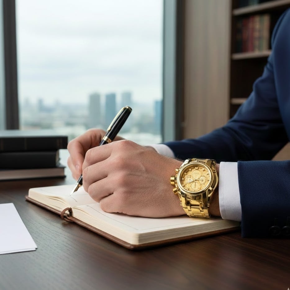 This luxe oversized dial commands an undeniable presence—bold, eye-catching, and totally elevated. Choose from a classic deep black dial, a regal navy blue finish, or a prestigious gold face, each elevated by an intricate Côtes de Genève pattern that adds a refined, high-end detail to the design.
